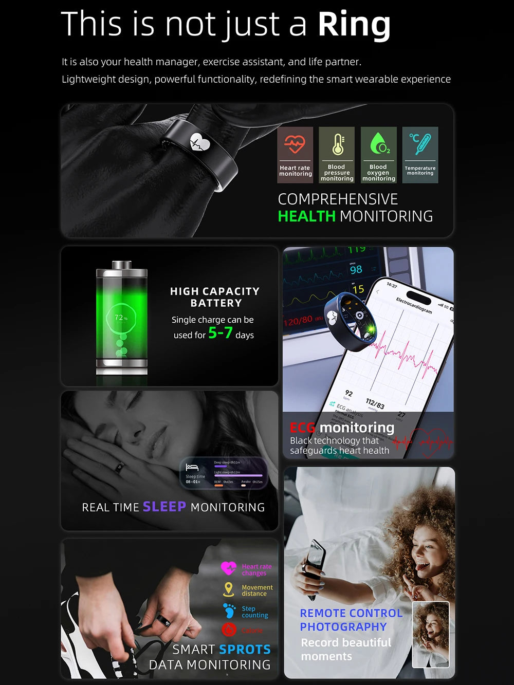 ECG Health Smart Ring Accurate Heart Rate Blood Oxygen Blood Pressure Detection Sleep Monitoring Fitness Rings IP68 Waterproof