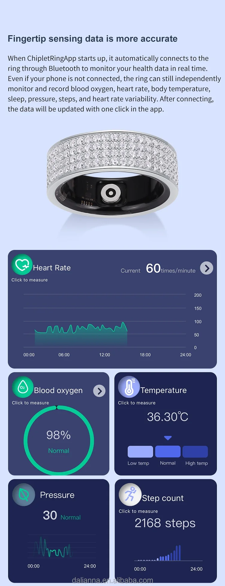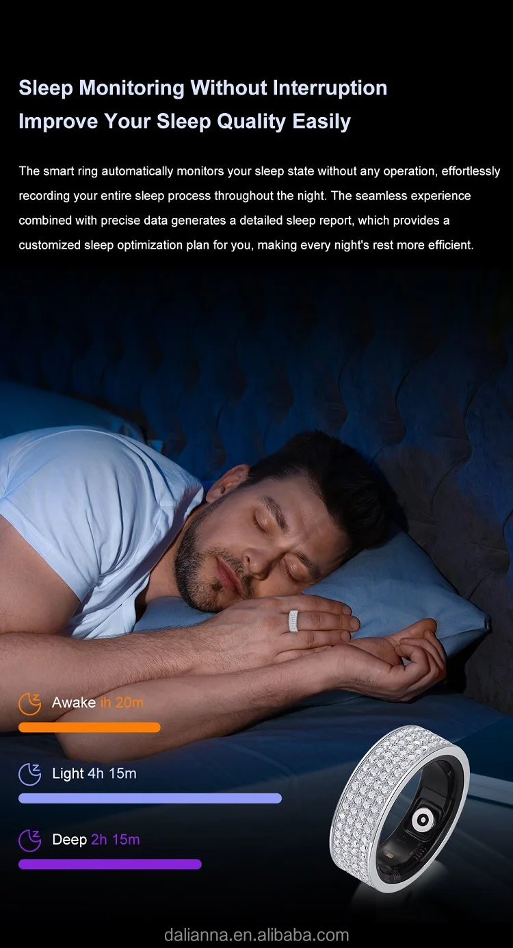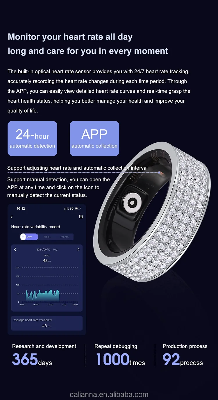 The smart ring has a health monitoring function, combining a number of advanced technologies, through the built-in sensor, it can real-time monitor the wearer's heart rate, blood oxygen level, body temperature, exercise, sleep quality and other physiological data, helping users to pay attention to their health status. Smart ring is not only versatile, inset with Moissanite diamonds, fashion and technology integration, with a comfortable wearing experience. This smart diamond ring the world's first sale, the market has not yet sold such smart diamond ring, the number is limited, the price is the factory wholesale price, need buyers please contact us in time! Please scan the code to download the APP, connect the Bluetooth, and open the smart and healthy life!