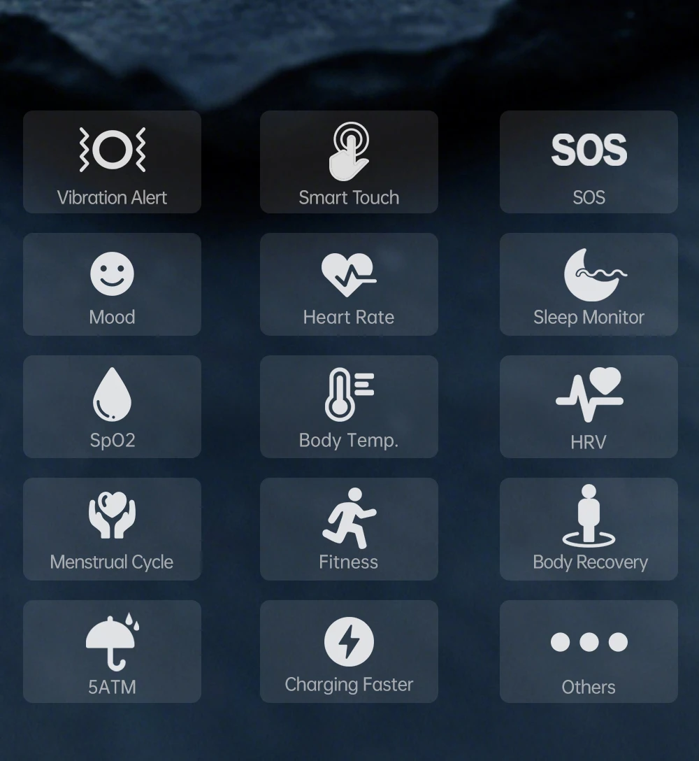 Metrics measured: Heart Rate Monitor,Sleep Monitor,Blood Oxygen Monitor,Body Temperature Monitor,Stress Monitor